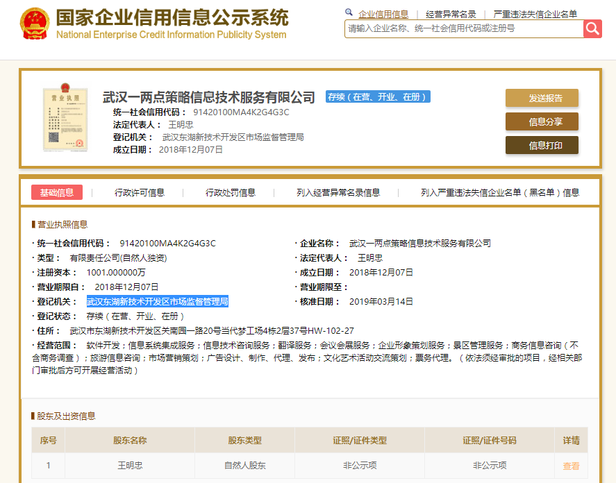 | 公司名称 | 武汉一两点策略信息技术服务有限公司 | 信用代码 | 91420100MA4K2G4G3C |