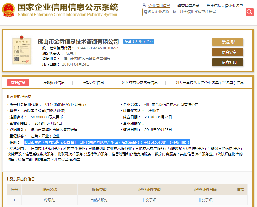 | 公司名称 | 佛山市金犇信息技术咨询有限公司 | 信用代码 | 91440605MA51KUH657 |