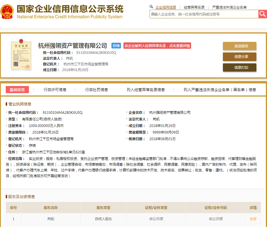 | 公司名称 | 杭州强翎资产管理有限公司 | 信用代码 | 91330104MA2B0KXU0Q |