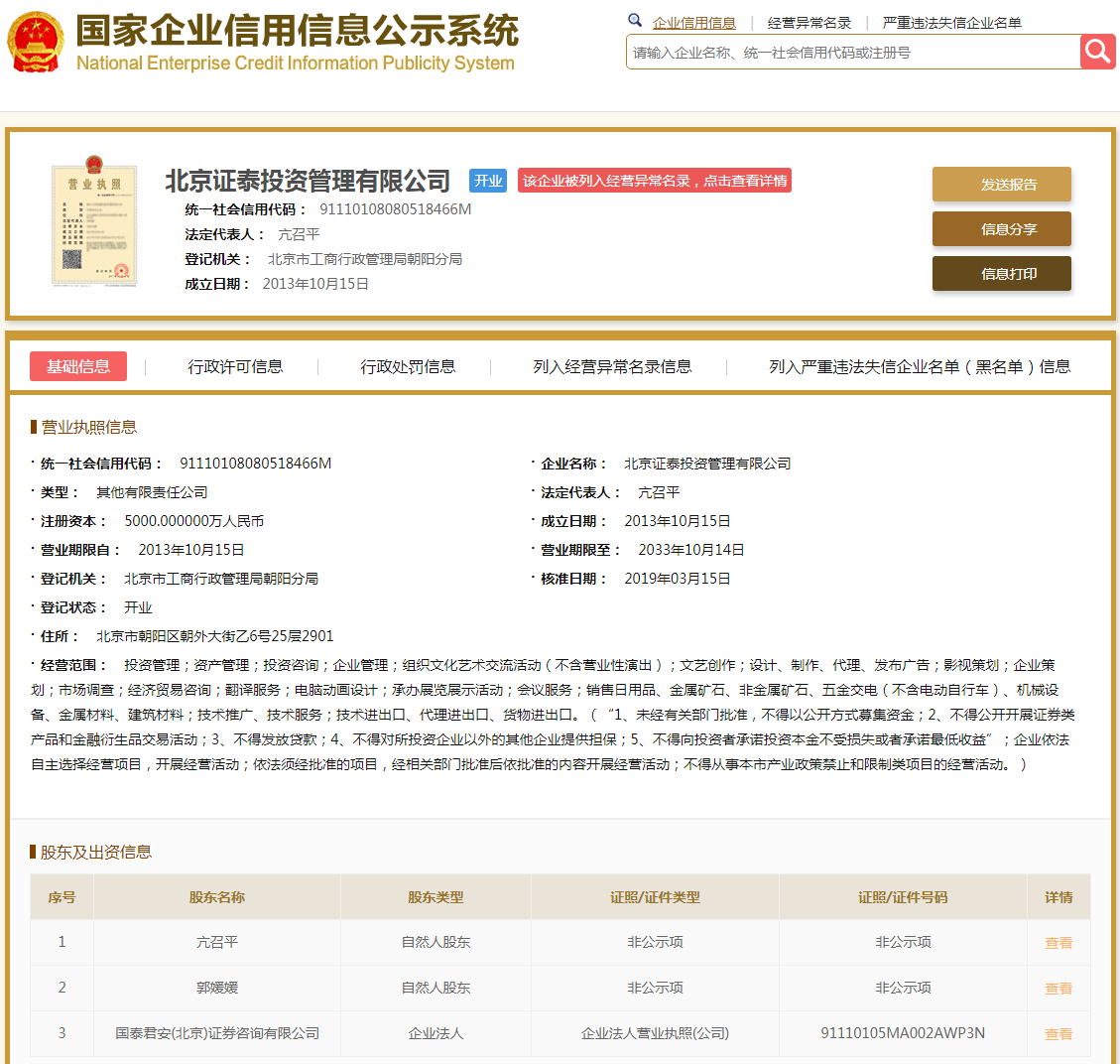 | 公司名称 | 北京证泰投资管理有限公司 | 信用代码 | 91110108080518466M |