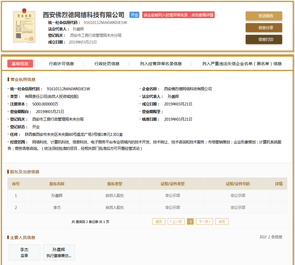 | 公司名称 | 西安佛烈德网络科技有限公司 | 信用代码 | 91610112MA6WK0JE1W |