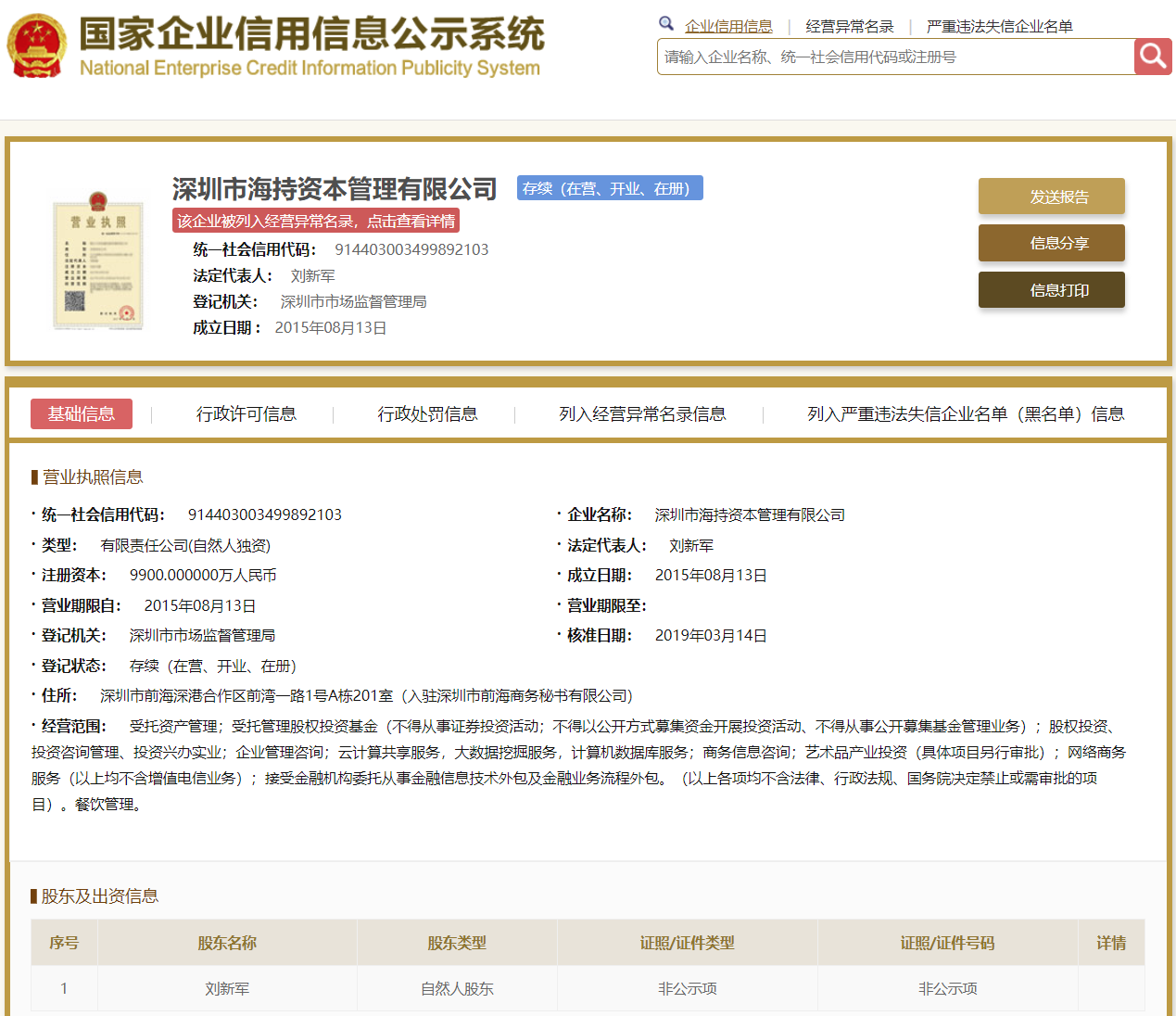 | 公司名称 | 深圳市海持资本管理有限公司 | 信用代码 | 914403003499892103 |