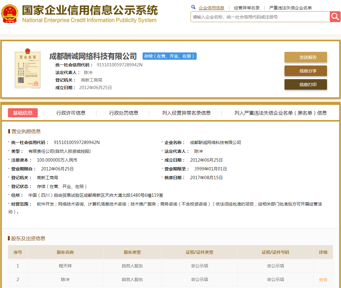 | 公司名称 | 成都酬诚网络科技有限公司 | 信用代码 | 91510100597289942N |