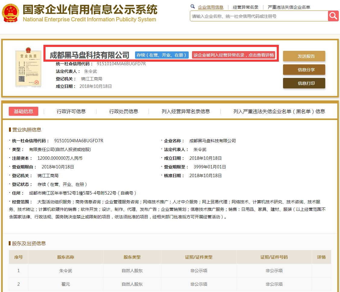 | 公司名称 | 成都黑马盘科技有限公司 | 信用代码 | 91510104MA6BUGFD7R |