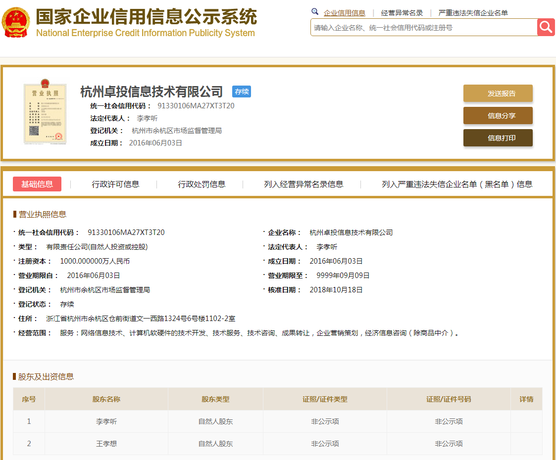 | 公司名称 | 杭州卓投信息技术有限公司 | 信用代码 | 91330106MA27XT3T20 |