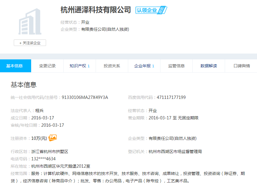 | 公司名称 | 杭州通泽科技有限公司 | 信用代码 | 91330106MA27X49Y3A |