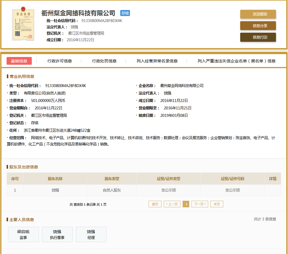 | 注册资本 | 501 万元 | 注册地址 | 浙江省衢州市衢江区东迹大道248幢522室 |