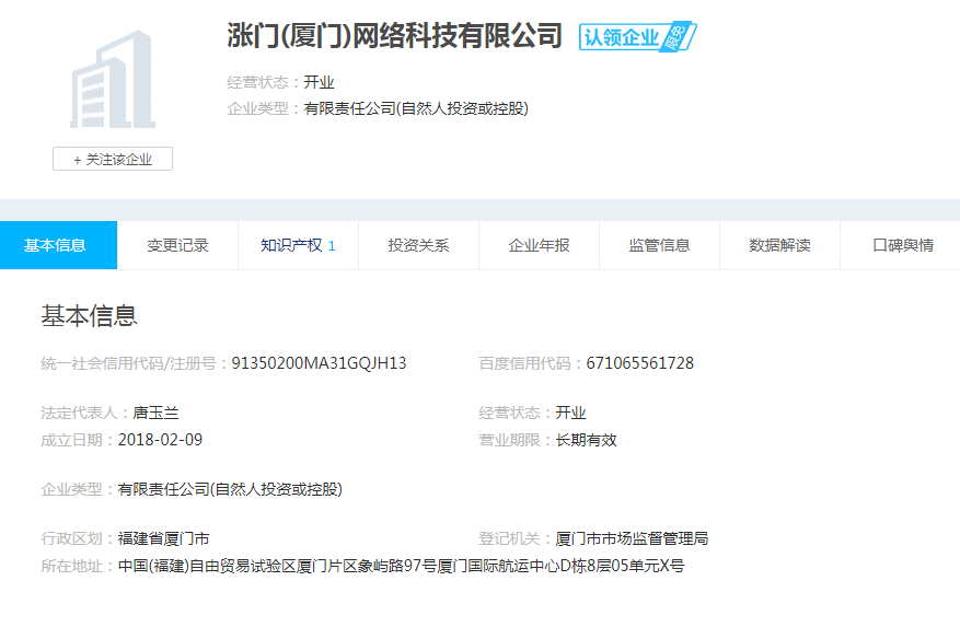 | 公司名称 | 涨门(厦门)网络科技有限公司 | 信用代码 | 91350200MA31GQJH13 |