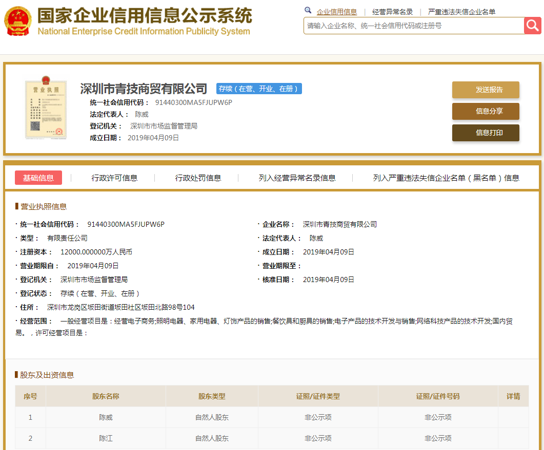 | 公司名称 | 深圳市青技商贸有限公司 | 信用代码 | 91440300MA5FJUPW6P |