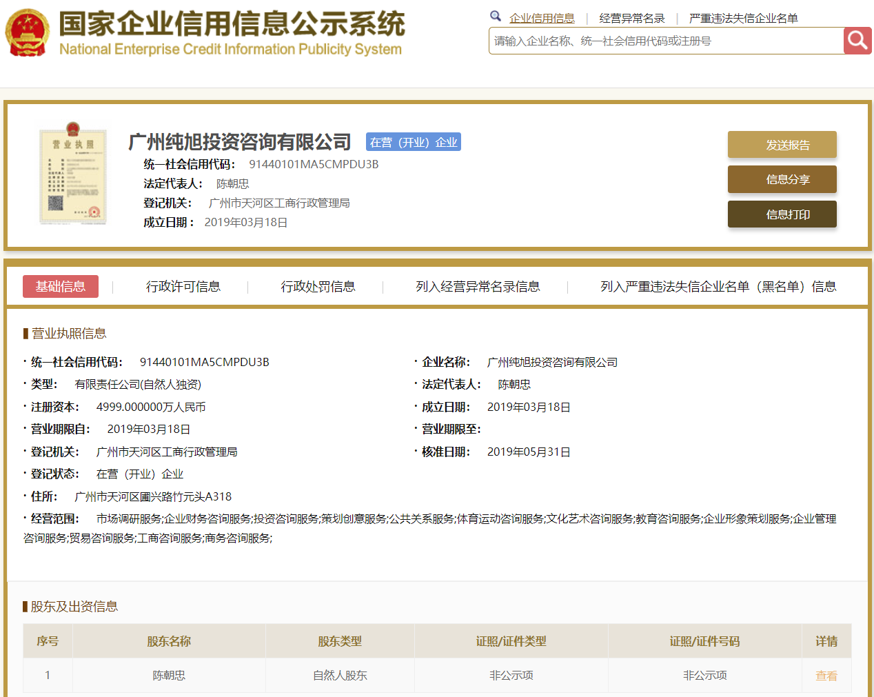 | 公司名称 | 广州纯旭投资咨询有限公司 | 信用代码 | 91440101MA5CMPDU3B |