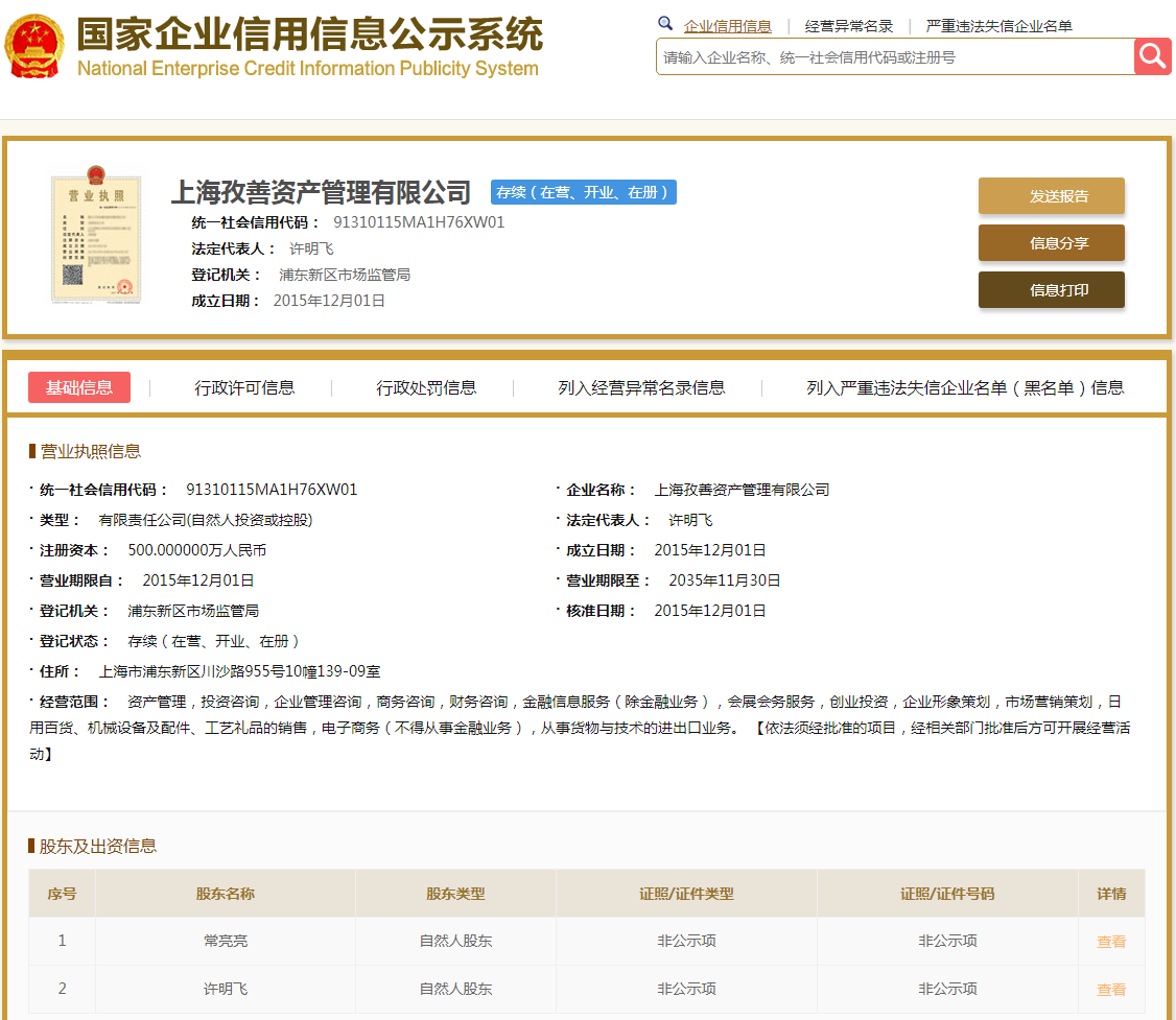 | 公司名称 | 上海孜善资产管理有限公司 | 信用代码 | 91310115MA1H76XW01 |