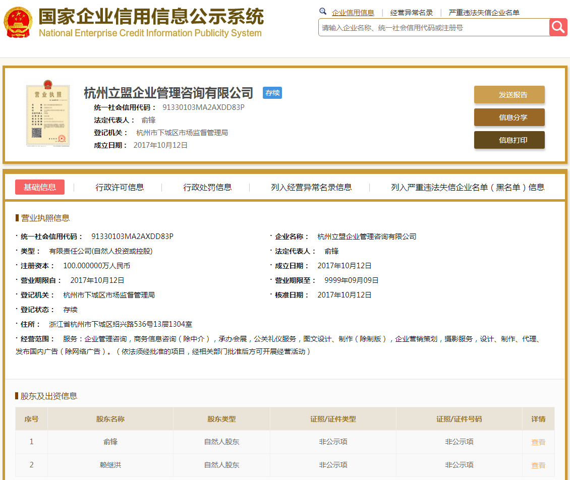 | 公司名称 | 杭州立盟企业管理咨询有限公司 | 信用代码 | 91330103MA2AXDD83P |