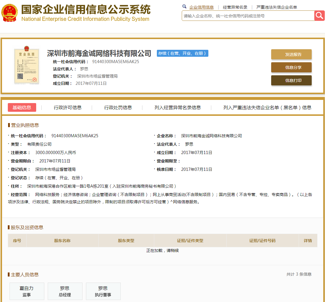 | 公司名称 | 深圳市前海金诚网络科技有限公司 | 信用代码 | 91440300MA5EM6AK25 |