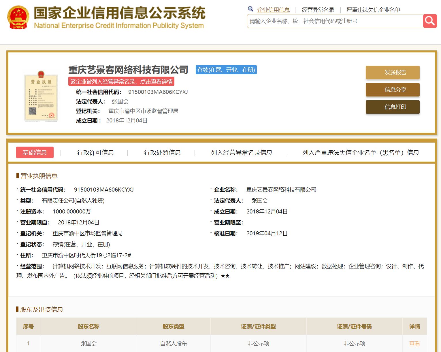 | 公司名称 | 重庆艺景春网络科技有限公司 | 信用代码 | 91500103MA606KCYXJ |