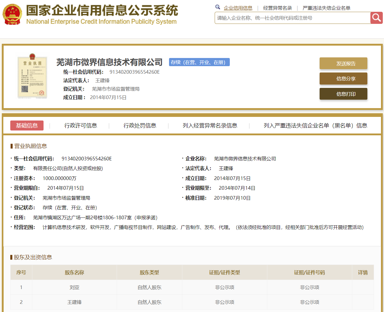 | 公司名称 | 芜湖市微界信息技术有限公司 | 信用代码 | 91340200396554260E |