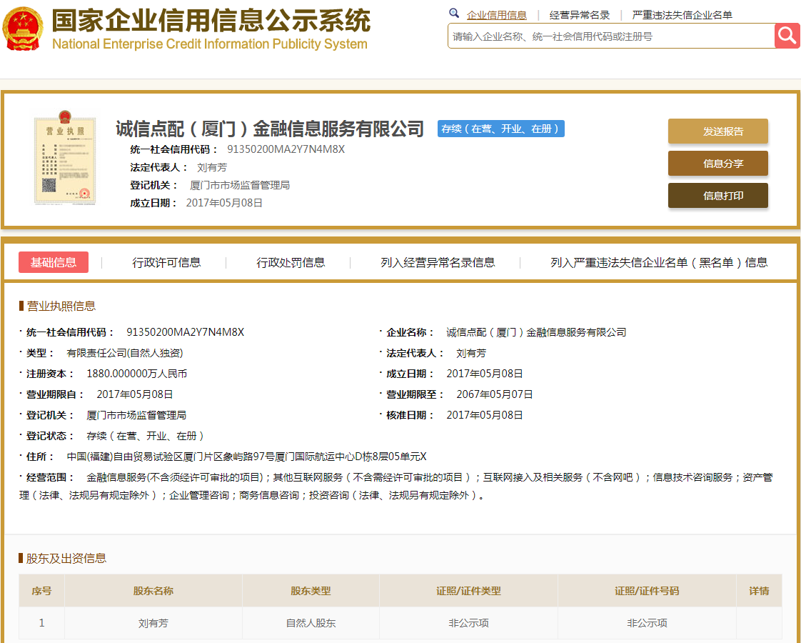 | 公司名称 | 诚信点配(厦门)金融信息服务有限公司 | 信用代码 | 91350200MA2Y7N4M8X |