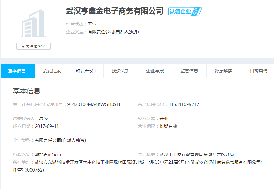 | 公司名称 | 武汉亨鑫金电子商务有限公司 | 信用代码 | 91420100MA4KWGH09H |