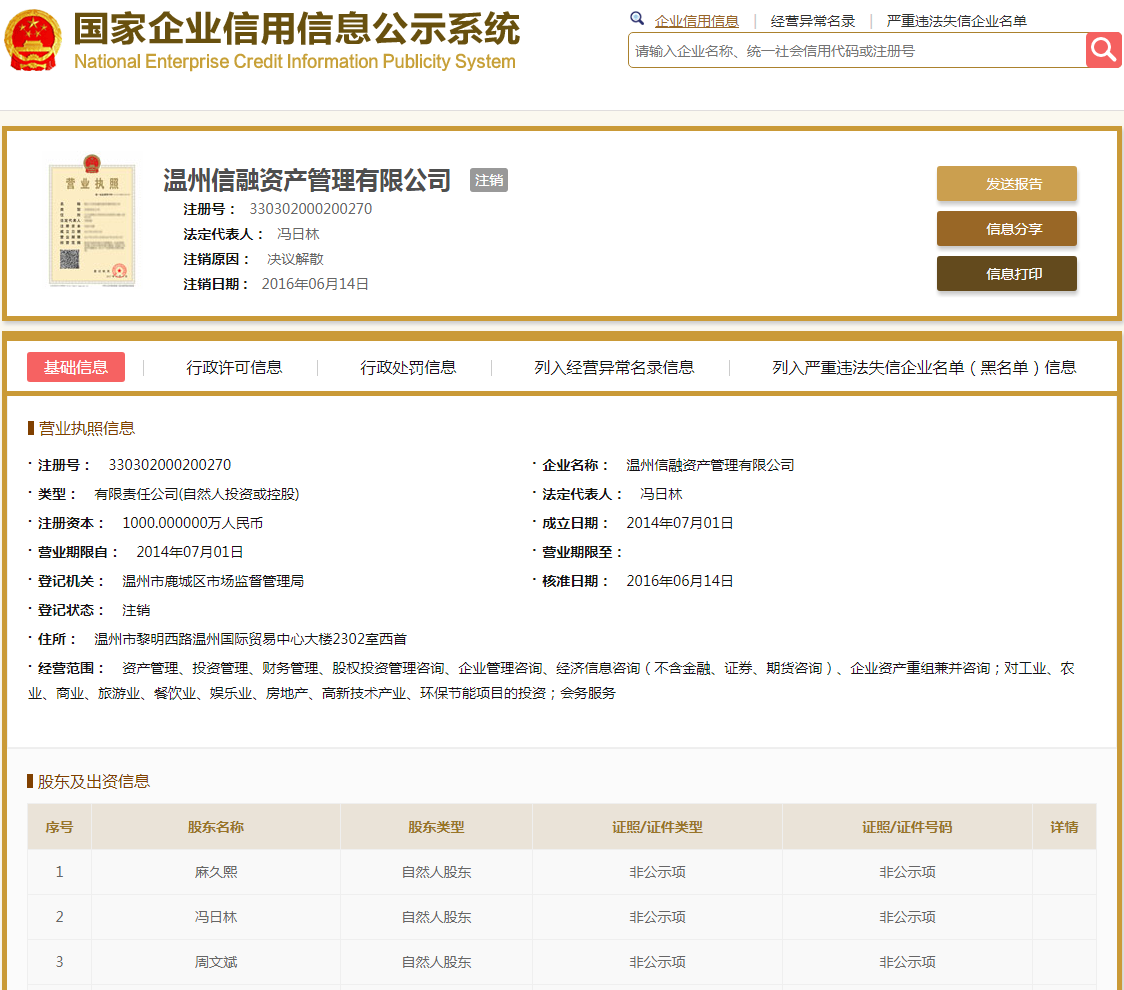 | 公司名称 | 温州信融资产管理有限公司 | 信用代码 | 330302000200270 |