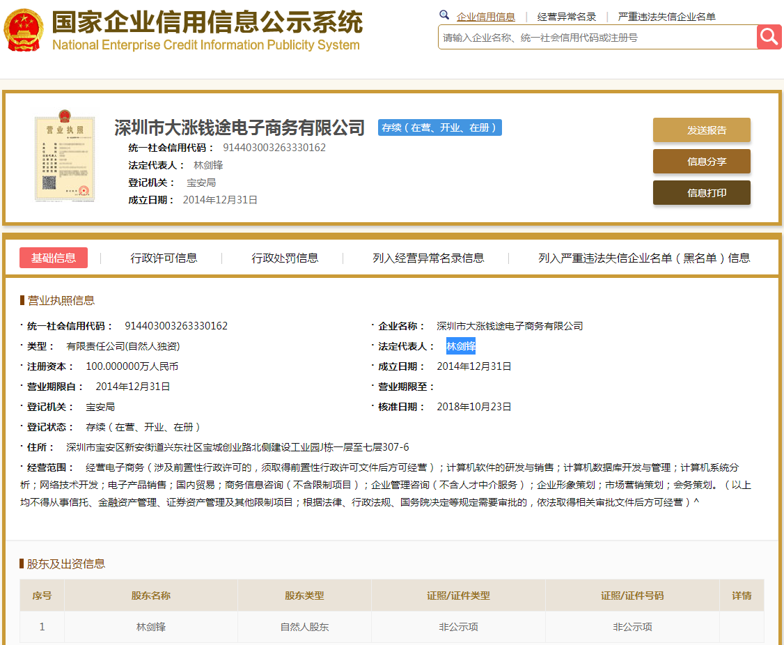 | 公司名称 | 深圳市大涨钱途电子商务有限公司 | 信用代码 | 914403003263330162 |