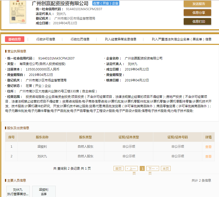 | 注册资本 | 13500.00 万元 | 注册地址 | 广州市南沙区大岗镇兴业路95号三楼330房(自主申报) |