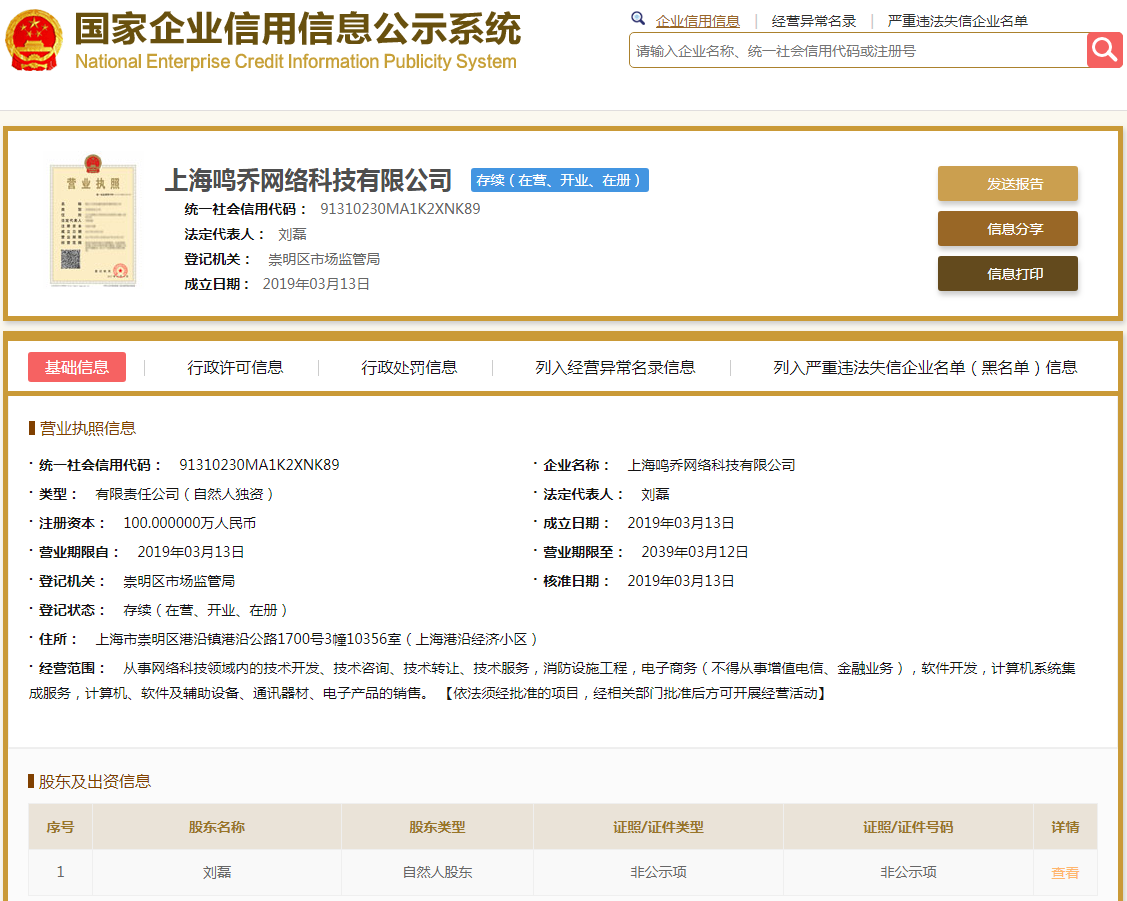 | 公司名称 | 上海鸣乔网络科技有限公司 | 信用代码 | 91310230MA1K2XNK89 |