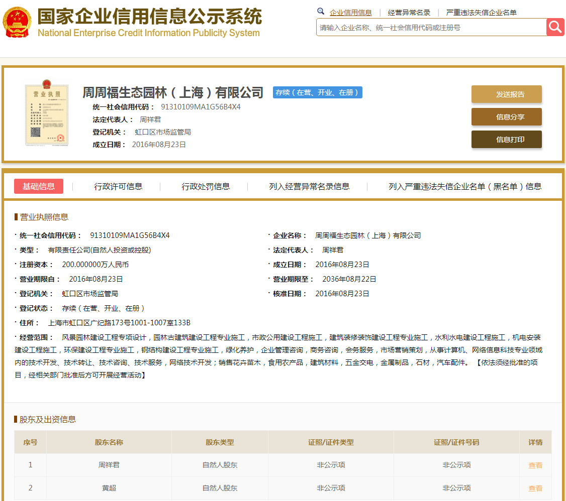 | 公司名称 | 周周福生态园林(上海)有限公司 | 信用代码 | 91310109MA1G56B4X4 |
