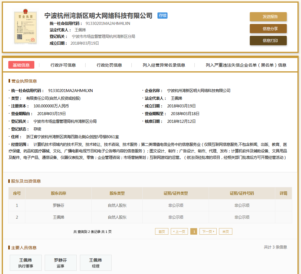 | 公司名称 | 宁波杭州湾新区明大网络科技有限公司 | 信用代码 | 91330201MA2AHM4LXN |