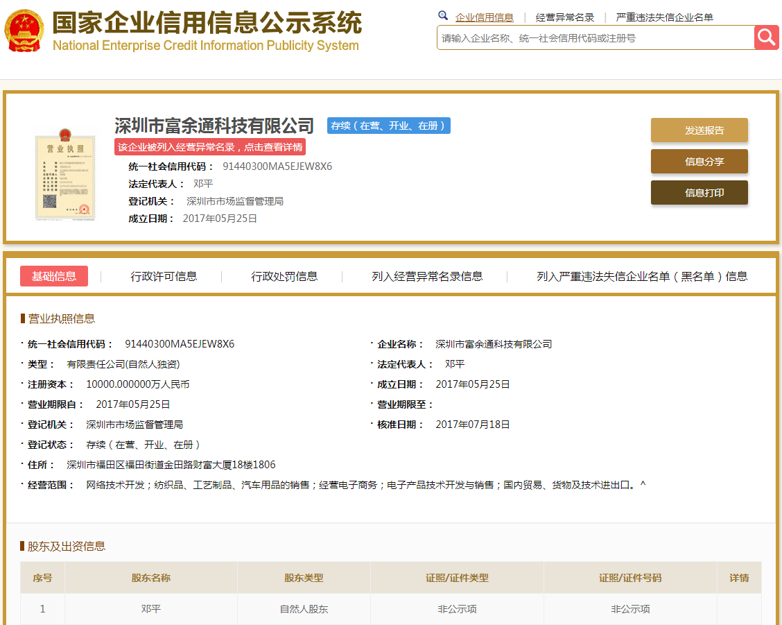 | 公司名称 | 深圳市富余通科技有限公司 | 信用代码 | 91440300MA5EJEW8X6 |
