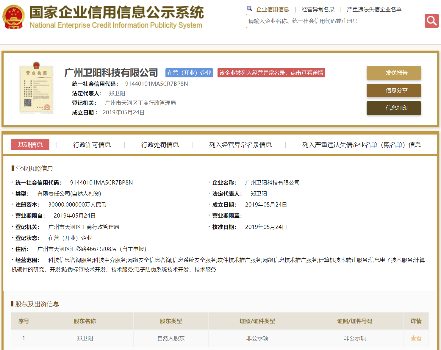 | 公司名称 | 广州卫阳科技有限公司 | 信用代码 | 91440101MA5CR7BP8N |