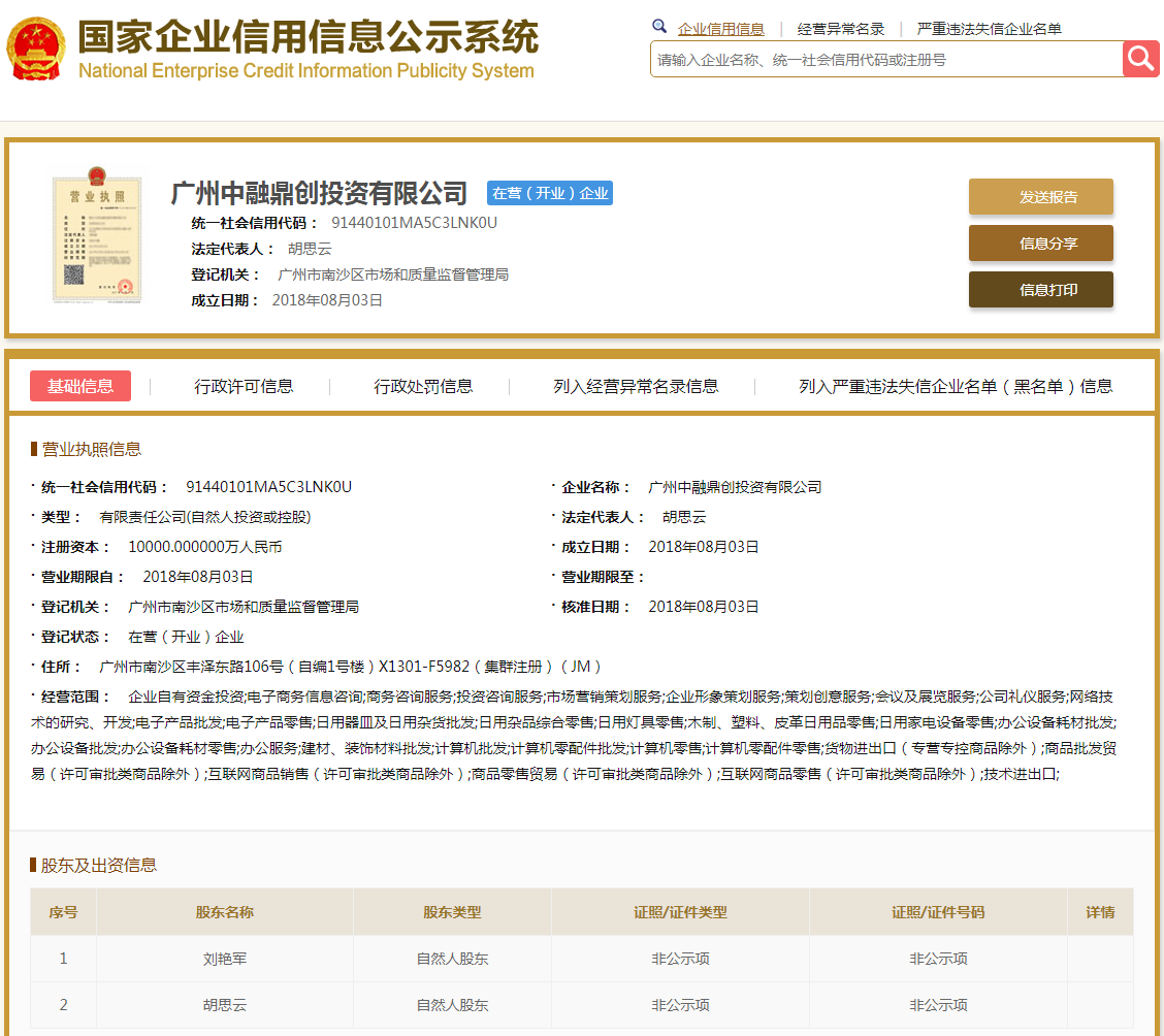 | 公司名称 | 广州中融鼎创投资有限公司 | 信用代码 | 91440101MA5C3LNK0U |