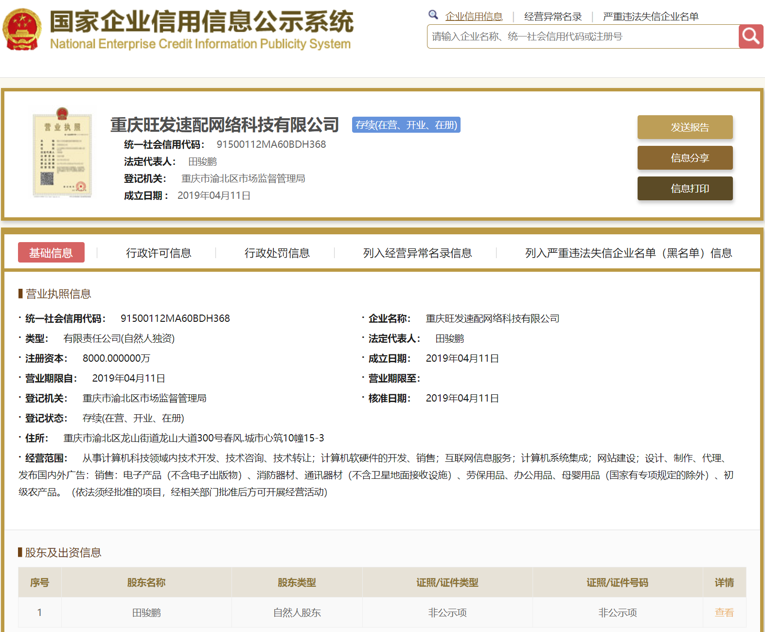 | 公司名称 | 重庆旺发速配网络科技有限公司 | 信用代码 | 91500112MA60BDH368 |