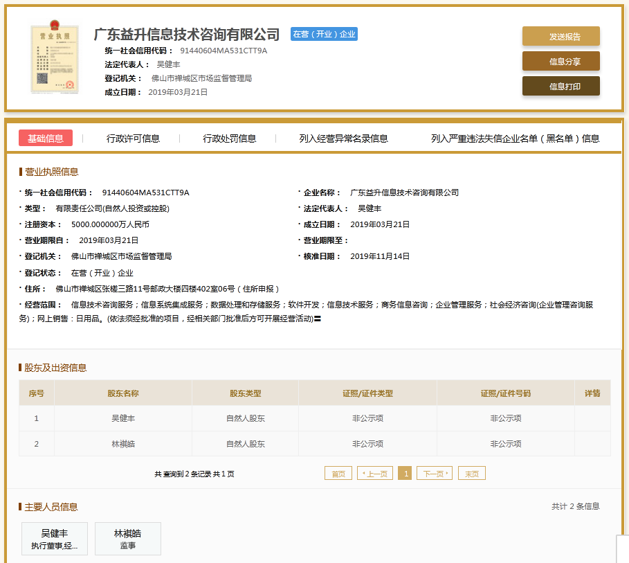 | 公司名称 | 广东益升信息技术咨询有限公司 | 信用代码 | 91440604MA531CTT9A |
