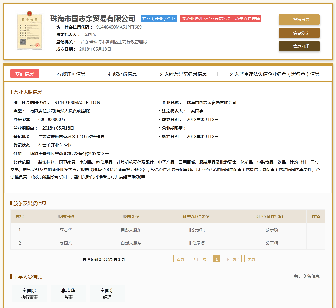 | 公司名称 | 珠海市国志余贸易有限公司 | 信用代码 | 91440400MA51PFT689 |