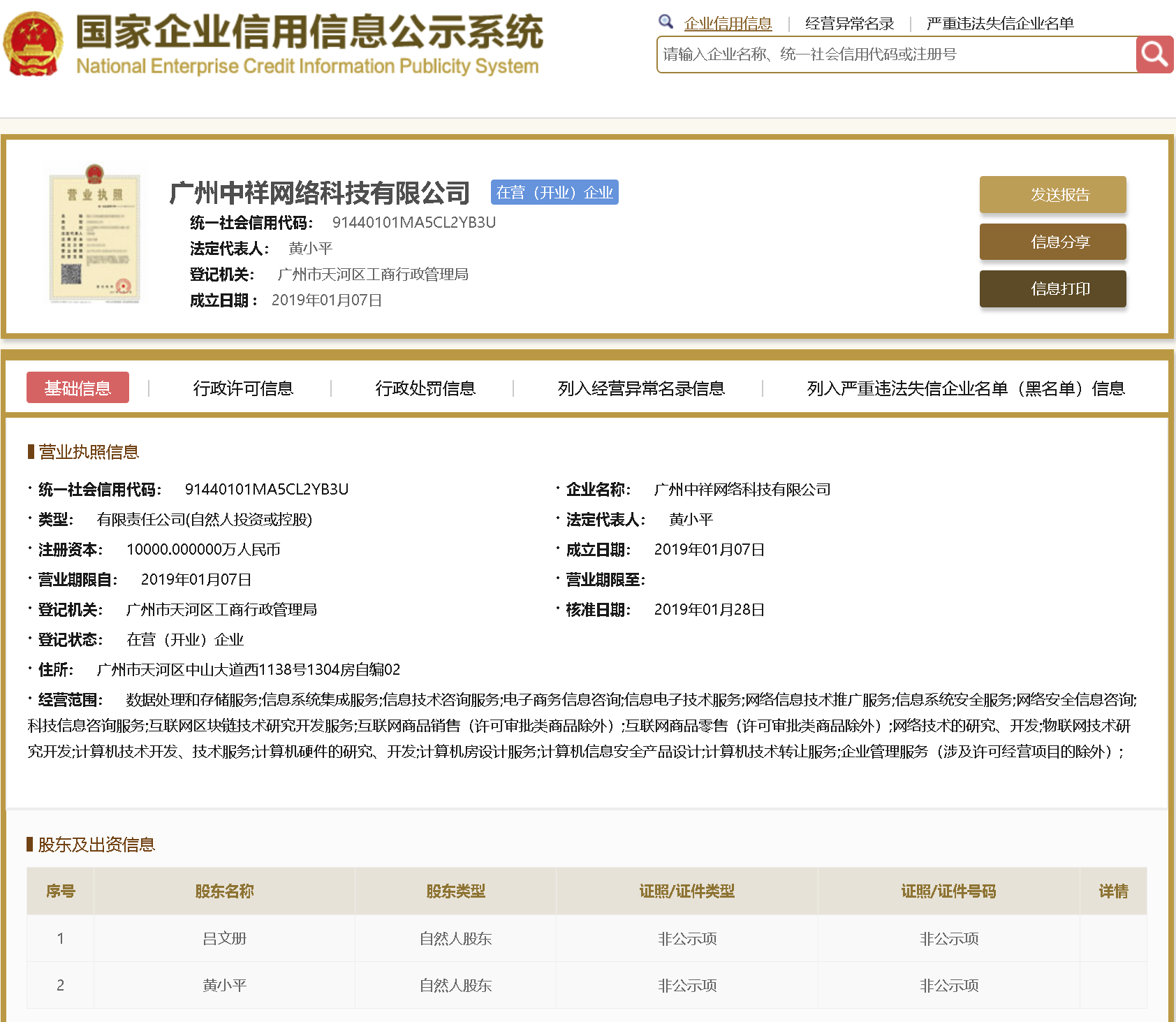 | 公司名称 | 广州中祥网络科技有限公司 | 信用代码 | 91440101MA5CL2YB3U |