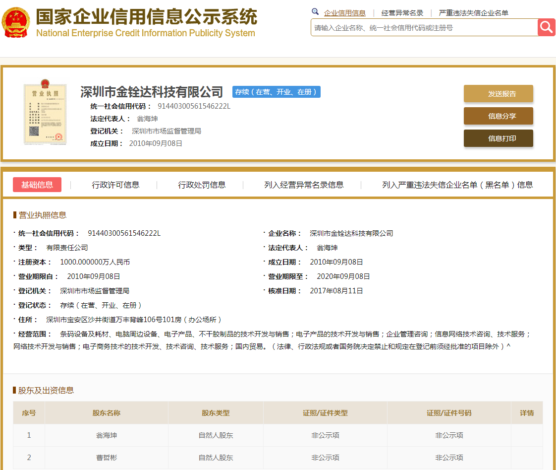 | 公司名称 | 深圳市金铨达科技有限公司 | 信用代码 | 91440300561546222L |