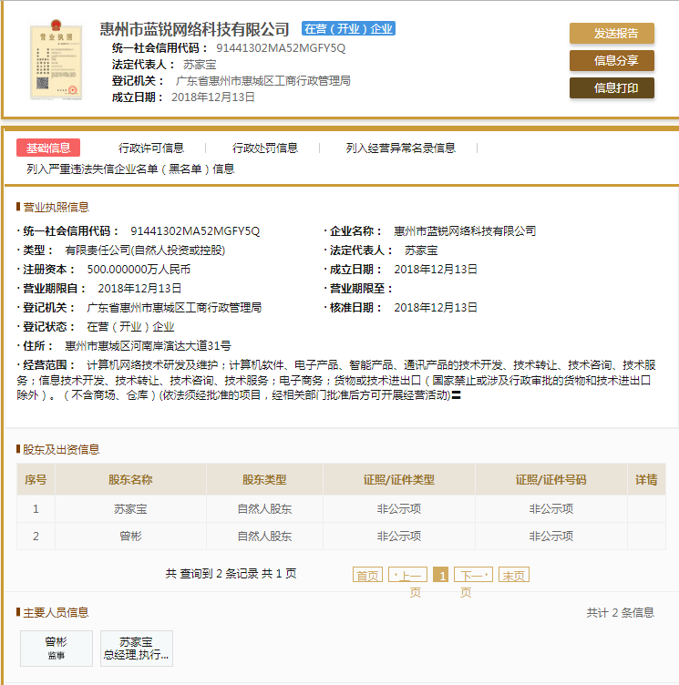 | 公司名称 | 惠州市蓝锐网络科技有限公司 | 信用代码 | 91441302MA52MGFY5Q |
