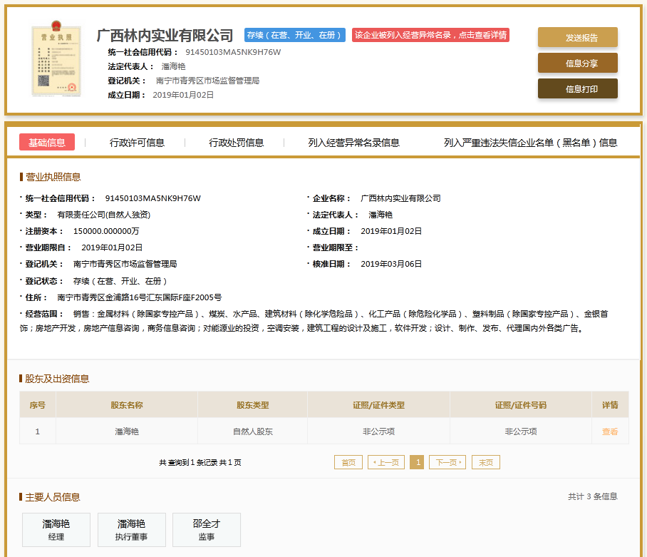 | 公司名称 | 广西林内实业有限公司 | 信用代码 | 91450103MA5NK9H76W |