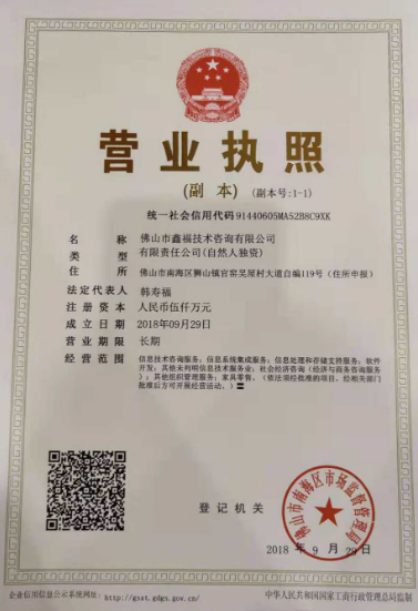 | 公司名称 | 佛山市鑫福技术咨询有限公司 | 信用代码 | 91440605MA52B8C9XK |