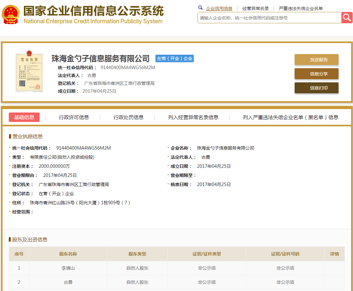 | 公司名称 | 珠海金勺子信息服务有限公司 | 信用代码 | 91440400MA4WG56M2M |