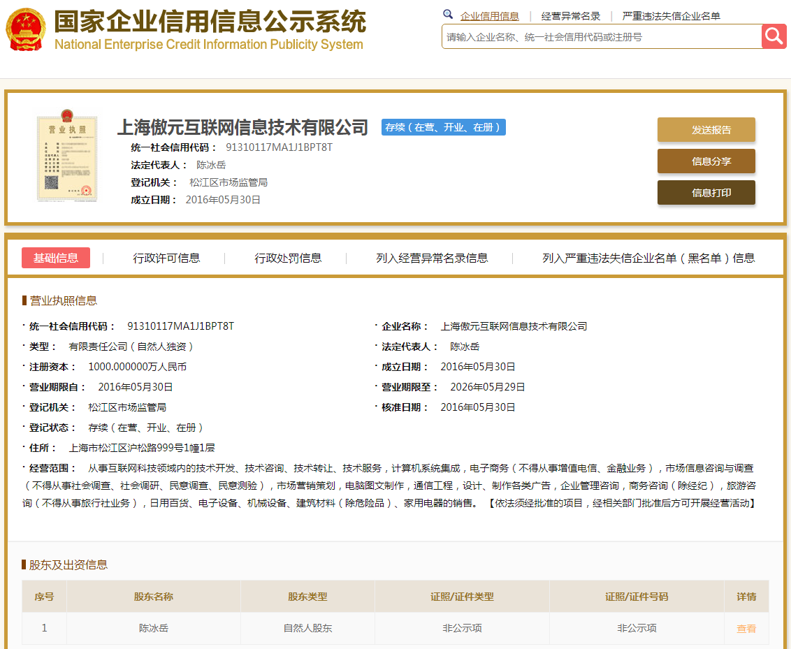 | 公司名称 | 上海傲元互联网信息技术有限公司 | 信用代码 | 91310117MA1J1BPT8T |