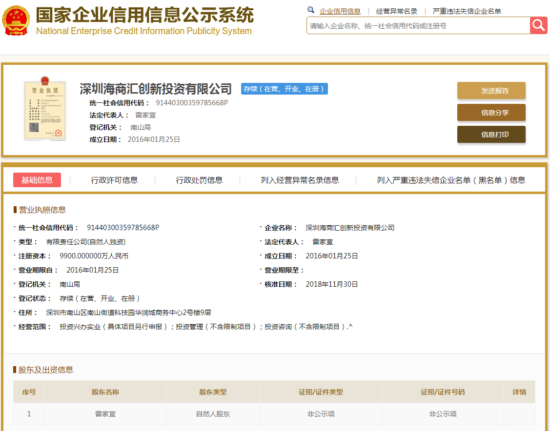 | 公司名称 | 深圳海商汇创新投资有限公司 | 信用代码 | 91440300359785668P |