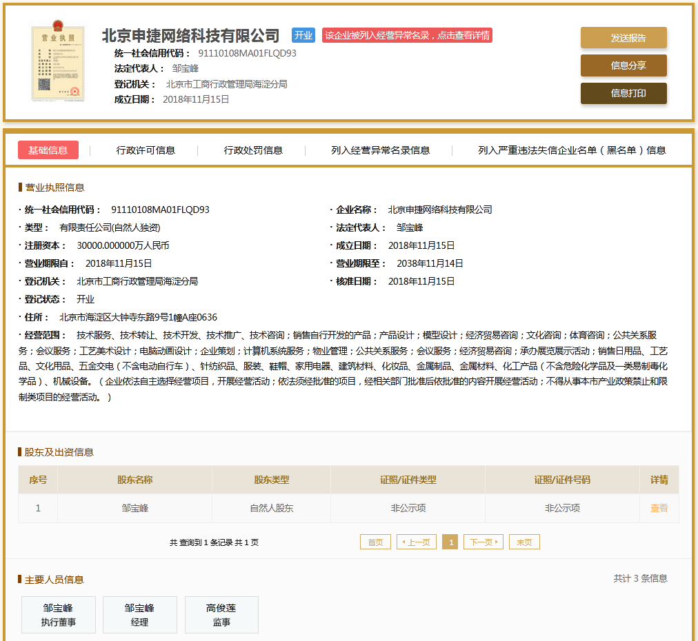 | 公司名称 | 北京申捷网络科技有限公司 | 信用代码 | 91110108MA01FLQD93 |
