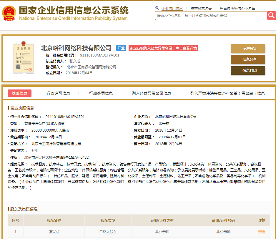 | 公司名称 | 北京峪科网络科技有限公司 | 信用代码 | 91110108MA01FYAE01 |