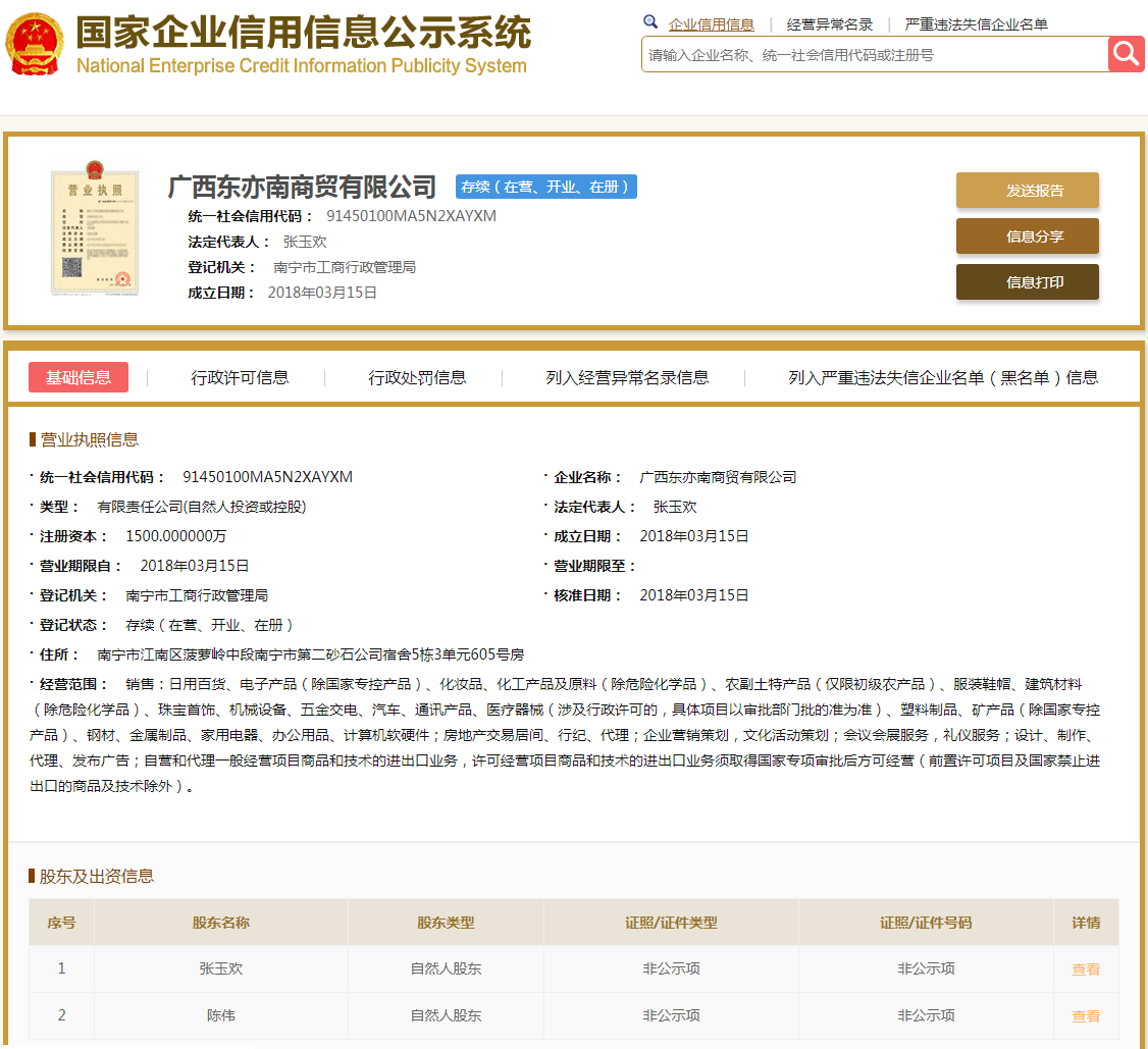 | 公司名称 | 广西东亦南商贸有限公司 | 信用代码 | 91450100MA5N2XAYXM |