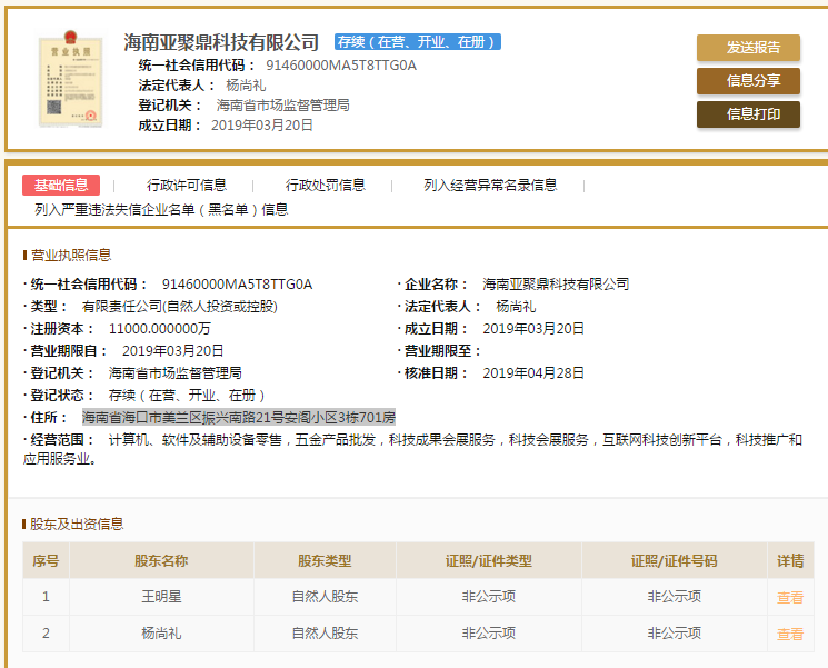 | 公司名称 | 海南亚聚鼎科技有限公司 | 信用代码 | 91460000MA5T8TTG0A |