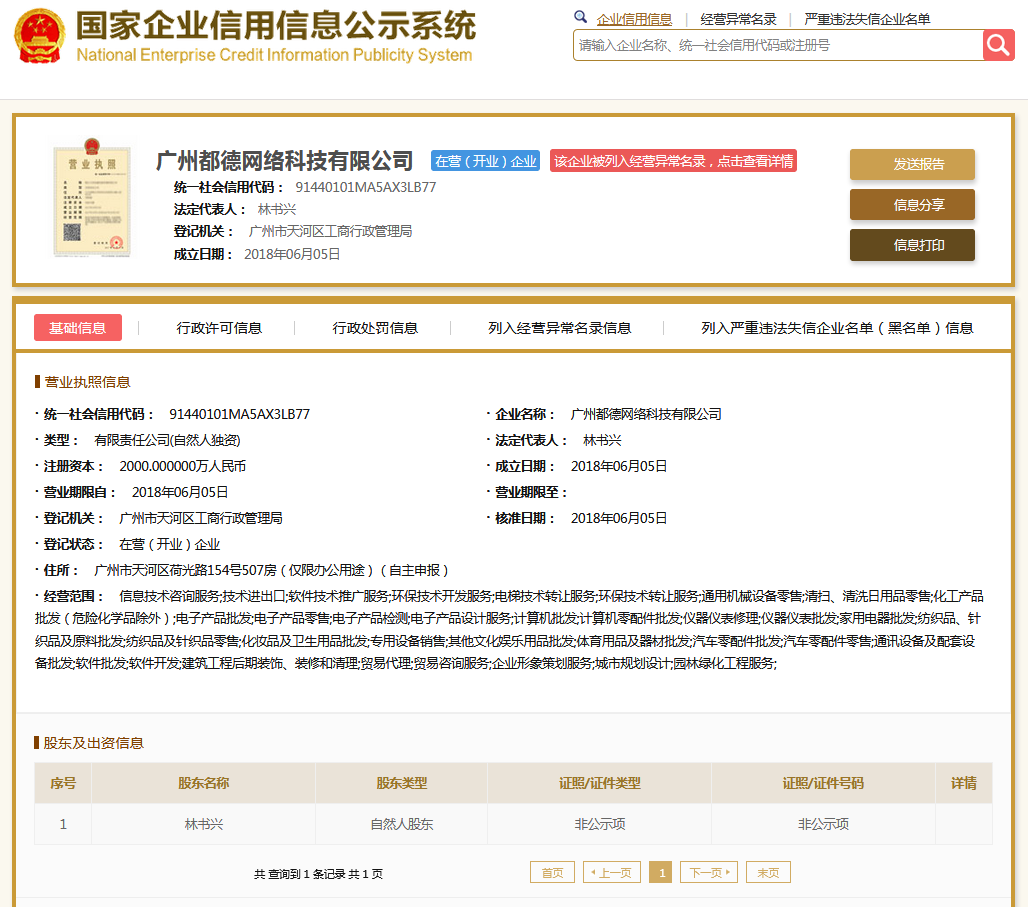 | 公司名称 | 广州都德网络科技有限公司 | 信用代码 | 91440101MA5AX3LB77 |