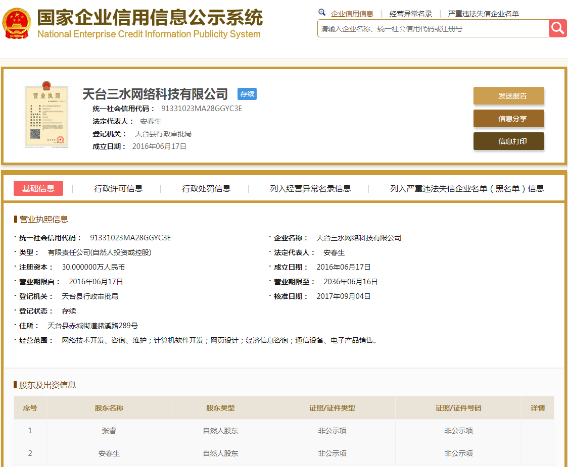 | 公司名称 | 天台三水网络科技有限公司 | 信用代码 | 91331023MA28GGYC3E |