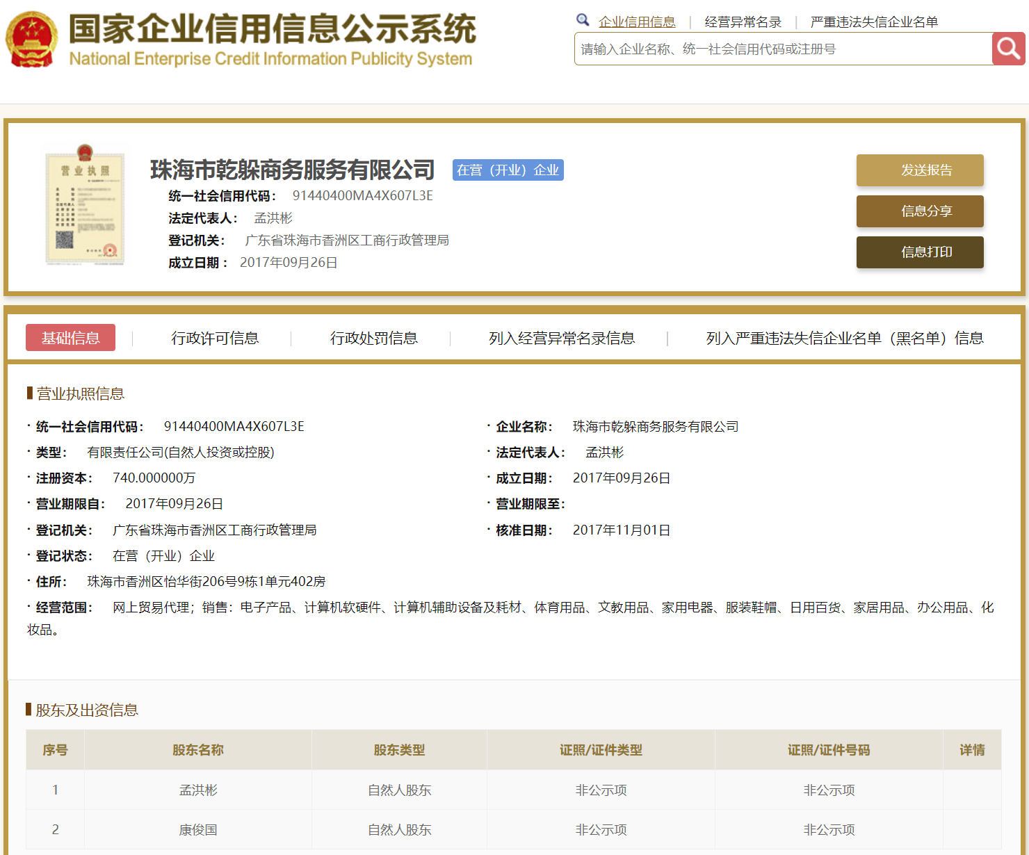 | 公司名称 | 珠海市乾躲商务服务有限公司 | 信用代码 | 91440400MA4X607L3E |