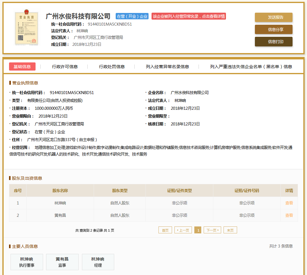 | 注册资本 | 1000 万元 | 注册地址 | 广州市天河区龙口东路337号(自主申报) |