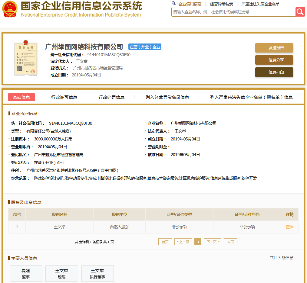 | 公司名称 | 广州举图网络科技有限公司 | 信用代码 | 91440101MA5CQ80F30 |